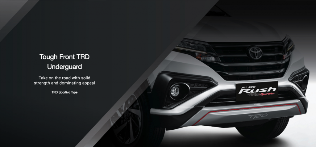 Rush yang berdimensi lebih panjang 230mm dari model sebelumnya tersedia dalam dua tipe yaitu G dan TRD Sportivo yang menawarkan desain eksterior dan interior serba baru. Demi menjaga karakter SUV yang lincah, lebar Rush dipertahankan 1.685 mm serta tinggi 1.705 mm dan jarak antar roda 2.685mm. Mobil ini menggunakan sistem penggerak roda belakang yang dipadukan dengan ground clearance setinggi 220mm.